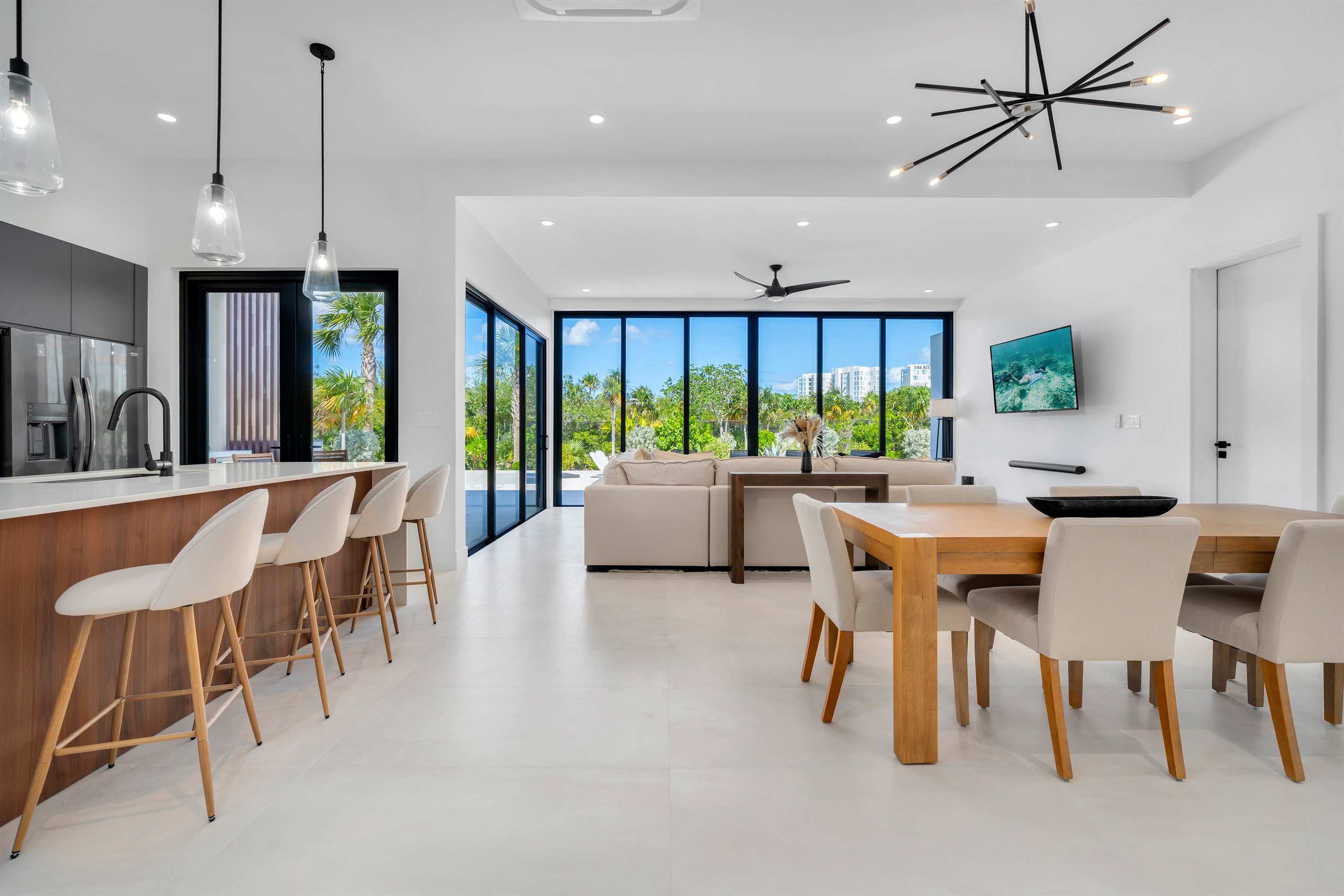 As you enter the great room through the large double doors you are greeted by 40-foot exposed ceilings and wall to wall sliding doors that look out over the expansive pool deck and further to the endless blue waters of the North Shore of Providenciales.