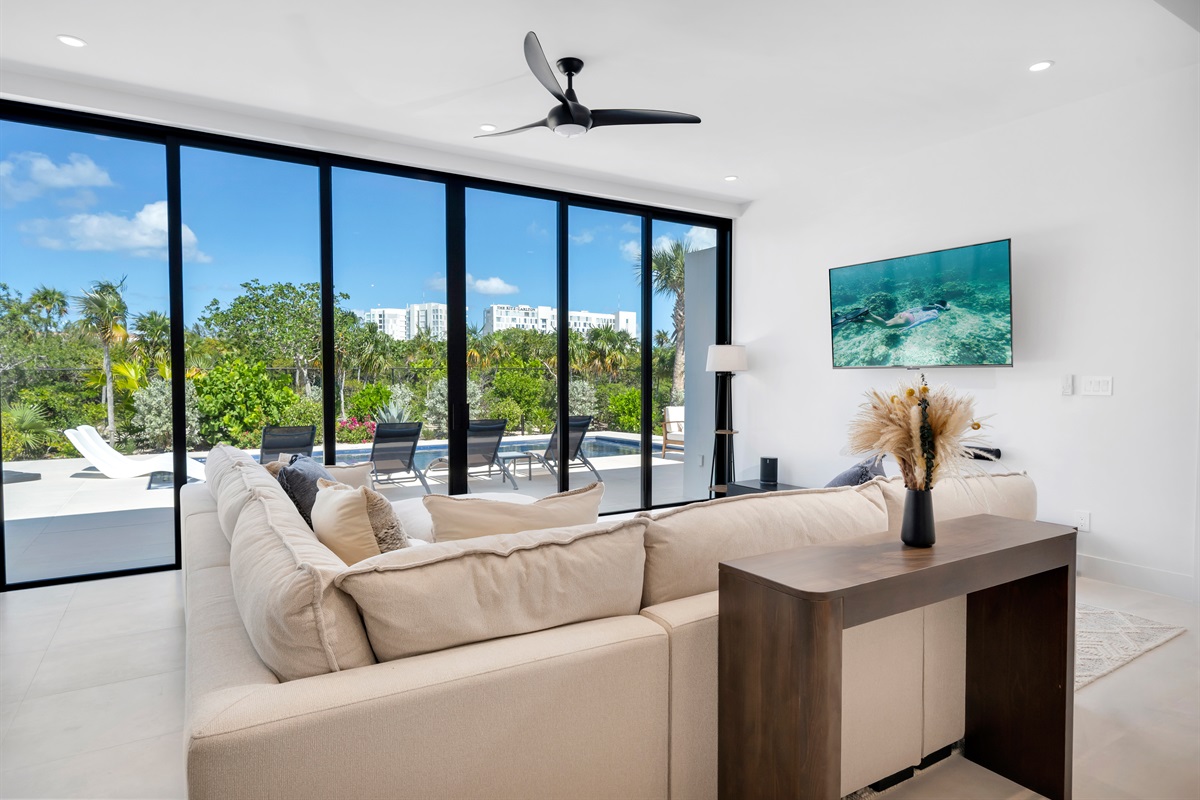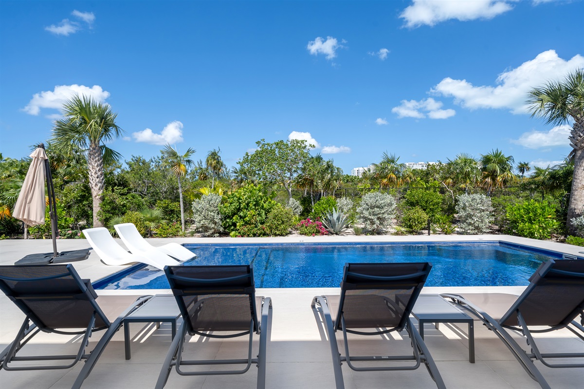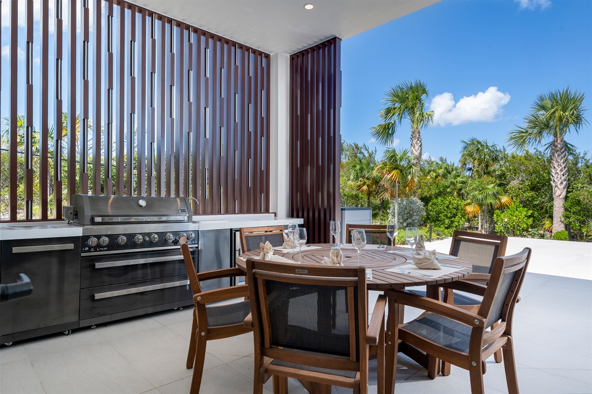 Step outside into your very own private oasis! The villa features a stunning pool surrounded by lush landscaping and ample seating. The pool deck is perfect for soaking up the sun or enjoying a refreshing dip. Just off the pool deck is an outdoor dining area with outdoor kitchen and large stainless steel propane grill.