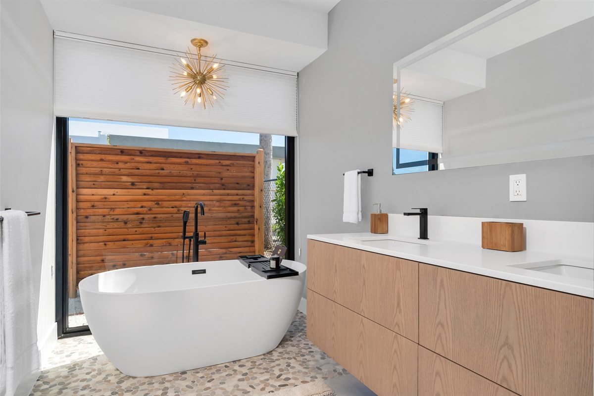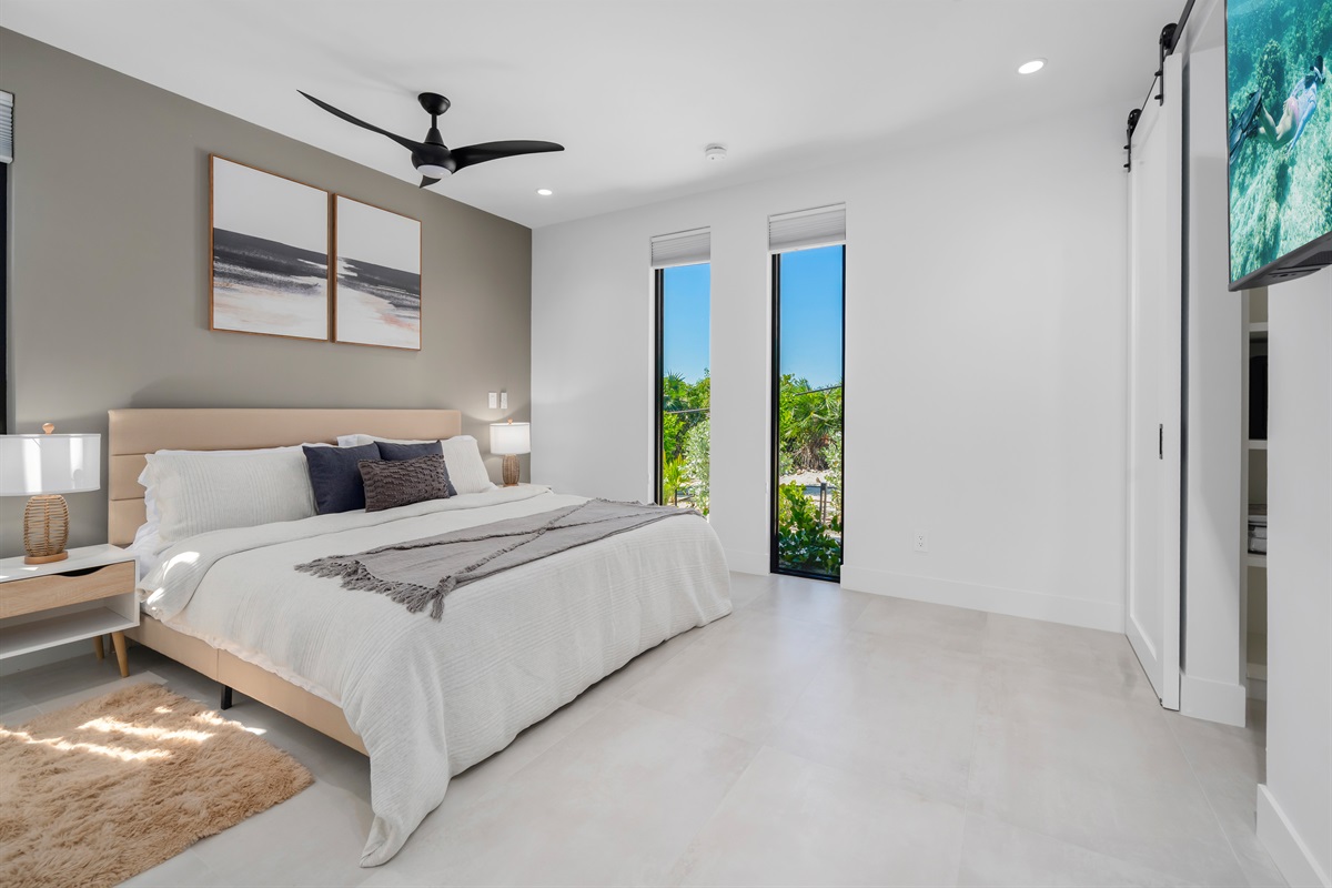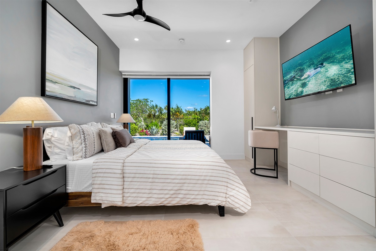 Of the 3 bedrooms the master bedroom is most fit for a king. The master suite has its own private pool deck access with lounge chairs. The master bathroom also has a soaking tub, walk-in shower, and his/her sinks.